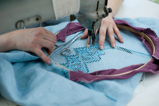 Вышивальщица Валентина Акуличева неуловимым движением пальцев наносит ажурную строчку на полотно будущей блузки, которая делается на заказ. Штучный экземпляр. Мастерица на фабрике 15 лет. Говорит, что никаких художественных училищ не заканчивала, и даже швейных. Училась швейному делу дома, у мамы, а вышиванию – у бабушки (обе были заняты в строчевышивальном промысле).
