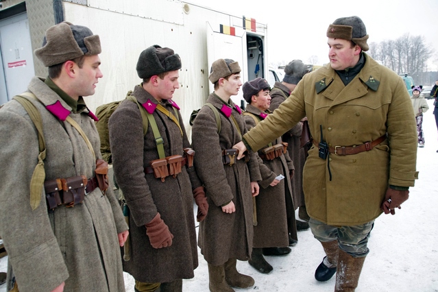 Правильность надевания амуниции проверяют многократно: тщательно осматривают молодых бойцов в строю, заставляя по нескольку раз поворачиваться кругом. Осматривают молодежь и выборочно. Если у кого-то сзади оторвалась пуговица или фляжка висит не под рюкзаком, – тут же отправляют в палатку к костюмерам исправлять оплошность. «Может, этого и не будет видно, но у нас всё по-настоящему, всё так, как было в 1941-м. Все костюмы тщательно продумывались, многое шилось на заказ, что-то искали в музеях. Правда жизни – прежде всего», – рассказывает художник по костюмам Виктория Игумнова. А молодые парни, получив оружие в руки, тут же стали с ним фотографироваться на мобильные телефоны. Интересно было видеть красноармейцев в форме, делающих селфи на современные айфоны.