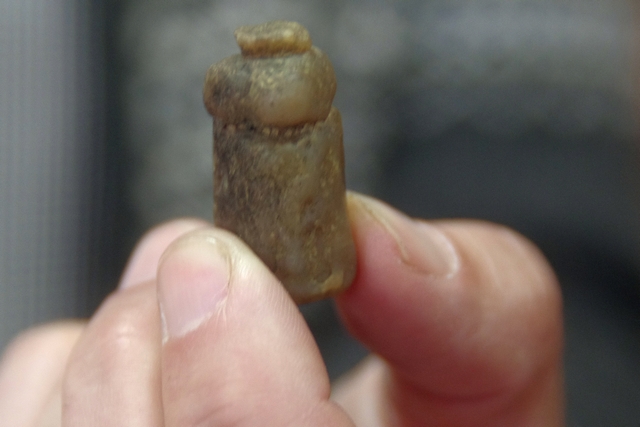 Раковины белемнита (в народе их называют «чертовыми пальцами») состоят из арагонита – минерала желто-медового цвета. Это достаточно мягкий минерал, который легко поддается обработке. Поэтому «чертовы пальцы» так широко использовались, в том числе в ритуальной культуре. Ими наносился орнамент на керамику: получался рисунок с точечками (так называемая ямочно-гребенчатая керамика, относящаяся к льяловской культуре). Рисунок нес в себе определенный смысл: ямки напоминали удары копьем, а они символизировали убитую добычу – пищу, свежее мясо, изобилие. В музее камня хранятся фрагменты такой керамики, да и самих белемнитов достаточно много. А вот украшение из его раковины – настоящая редкость. Подобные поделки были найдены лишь в Воронежской области.