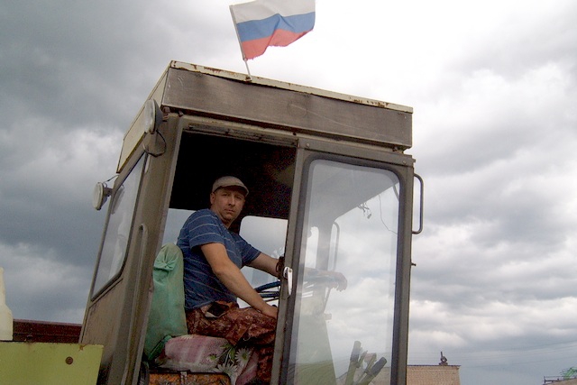 Дмитрий Ланцов выводит свой немецкий кормозаготовительный комбайн под российским флагом.
