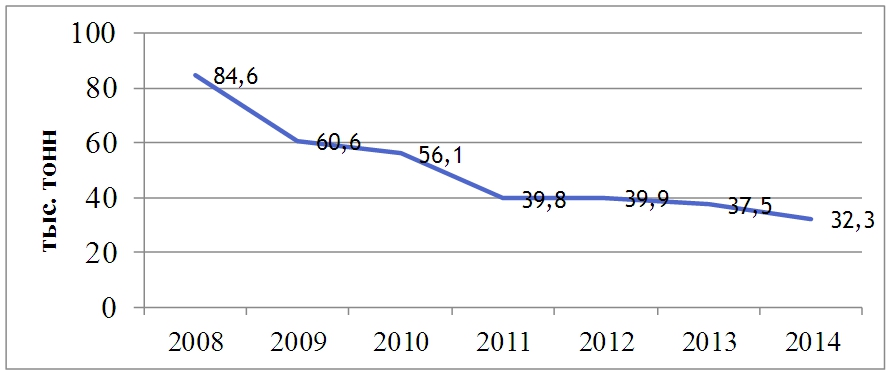 Выпуск хлопчатобумажной пряжи за период 2008–2014 годов
