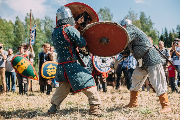 Куда зрелищнее боев показательных поединки соревновательные. Здесь здоровые мужики бьются во всю силу мечами и топорами. До пяти попаданий по шлему или корпусу или до падения противника. Конечно, мечи и щиты не заточены, но даже таким оружием можно нанести серьезные травмы. Про синяки и ссадины я умолчу – на них никто не обращает внимания.