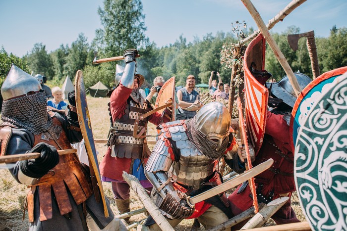 На поле и участники, и гости пытаются опрокинуть стену щитов из намертво вставших дружинников. Кстати, вместе со взрослыми реконструкторами в показательных боях участвуют и мальчишки 10-12 лет. Женщины готовятся к конкурсу костюма и кухни (все рецепты исключительно исторические). В лагере идет мастер-класс по кузнечному делу.
