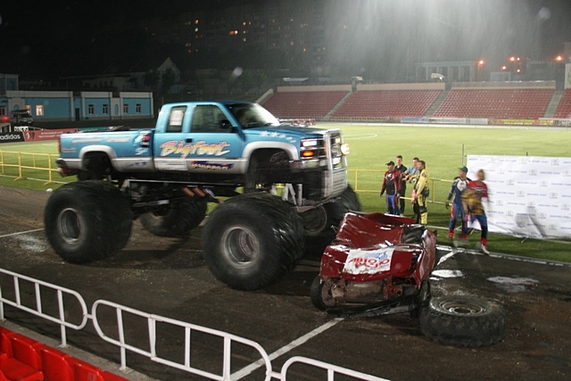 Выезд гигантских машин оставили на десерт шоу. Big Power является единственным в России МАЗом, который может вставать на задние колеса. Завершающим номером стала битва отечественного автомобиля против так называемой «Большой ступни». На радость зрителям «шестерку» превратили в груду металла.