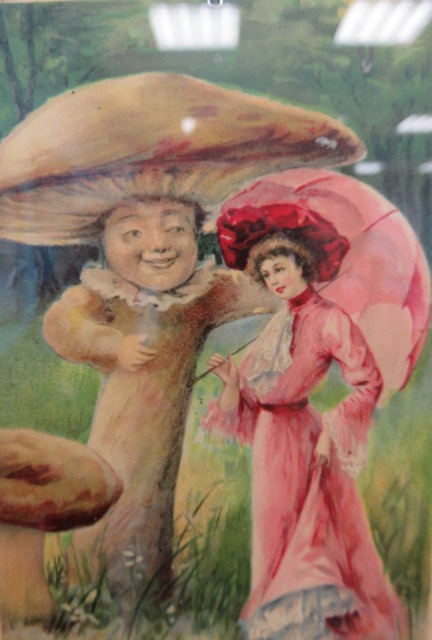 Интересна и подборка зарубежных открыток. На одной из них изображена дама с мухомором. Но причем здесь мухомор? «Раньше, празднуя йоль – день зимнего солнцестояния в Германии, люди употребляли мухоморы, – говорит Андрей Лапыкин. – Вероятно, эта традиция пошла со времен кельтских и германских племен, когда волхвы использовали эти грибы для своих мистерий».