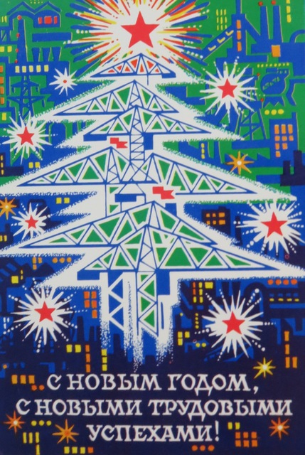 В блоке «Агитационная новогодняя открытка» на поздравительных картинках изображены гербы, звезды, есть даже новогодние ели, нарисованные из линий электропередачи и падающих искорок сварки.