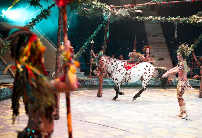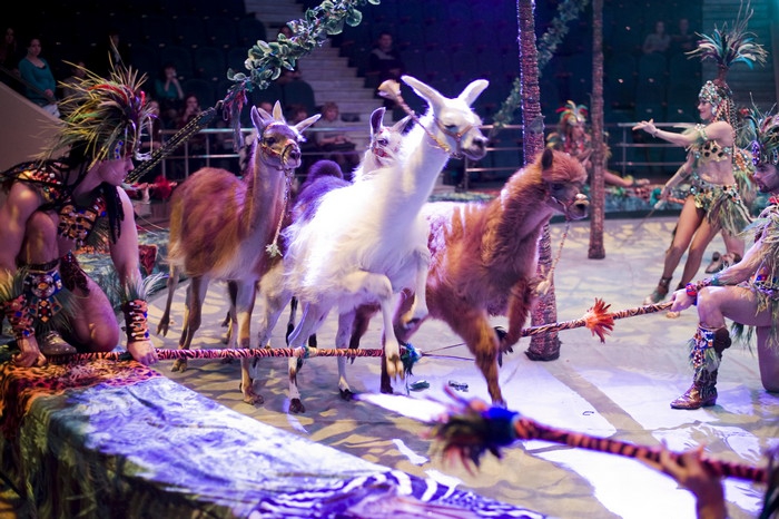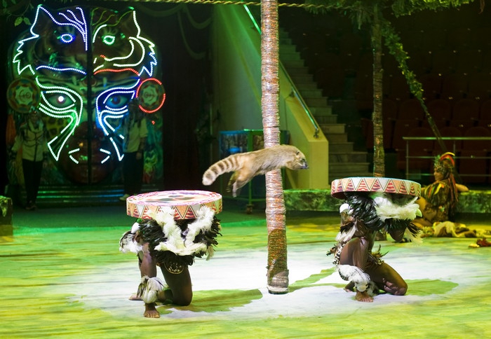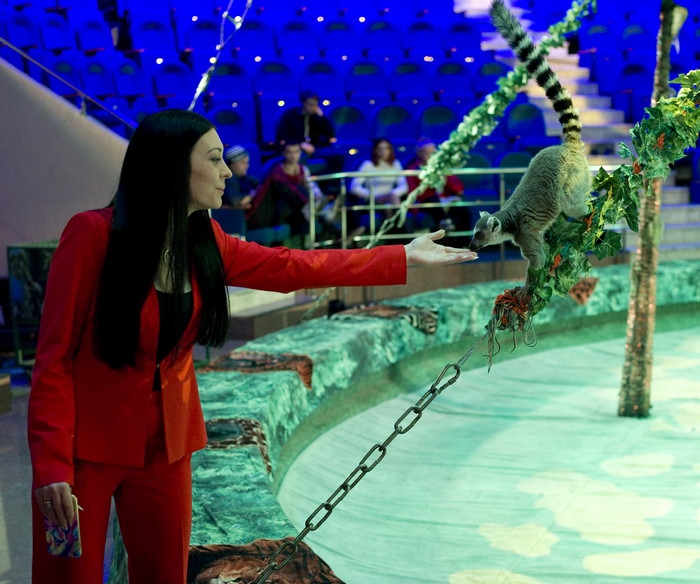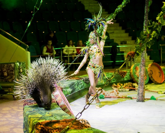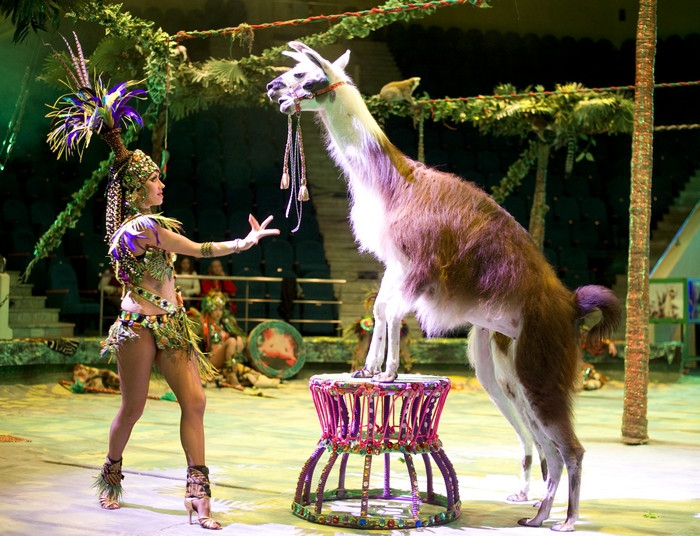 В соседних вольерах бегают по решетке на потолке безобидные носухи, рядом спят дикобразы, которые тоже выходят на сцену во время представления. Увидит зритель и лошадей, и зебру, и лам, и множество других животных. «Многие считают, что в цирке животных мучают. Но вы посмотрите, как они у нас выглядят, и вам сразу станет ясно, как мы с ними обращаемся. А уж если кто-то из них заболеет – собирается целый консилиум ветеринаров. И людей-то, кажется, хуже лечат», – говорит пиар-директор новогоднего циркового шоу Элина Лазаревская.