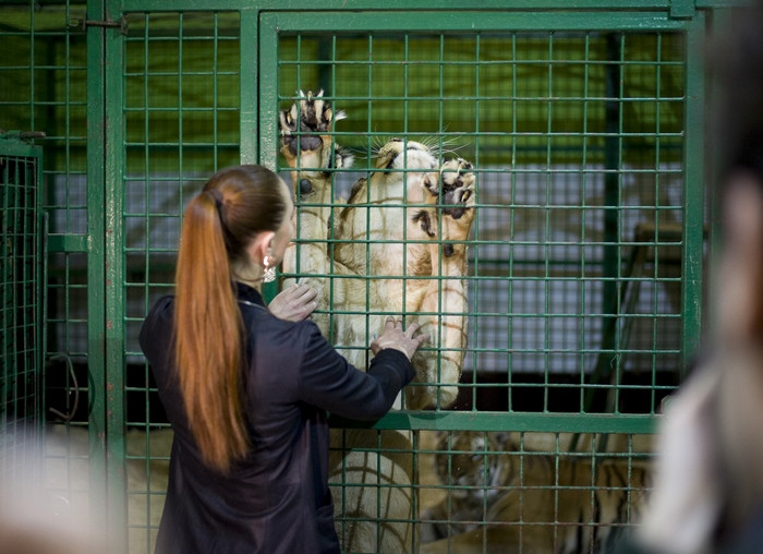 «Аттракцион необычен тем, что на манеже присутствуют сразу 11 хищников, – поясняет Людмила Суркова. – Те номера, которые показываю я, не делает больше никто в мире». Как этой хрупкой женщине удается дрессировать больших кошек, каждая из которых весит около 200 килограммов, остается загадкой. Поинтересовались журналисты и тем, сколько тигры и львы едят. Оказалось – очень много: от 6 килограммов мяса в день. И это кроме овощей и других добавок.