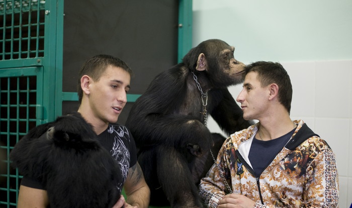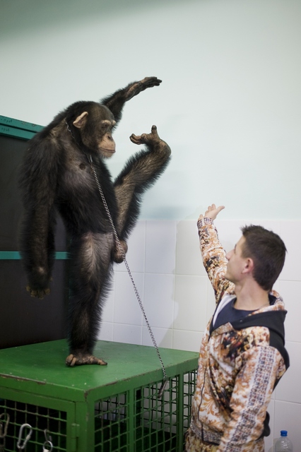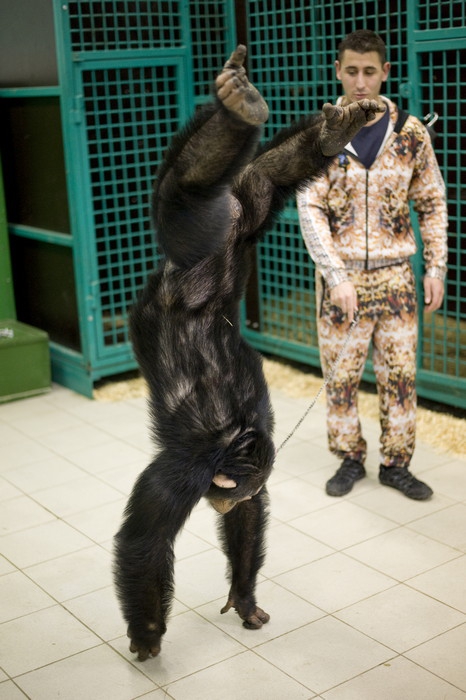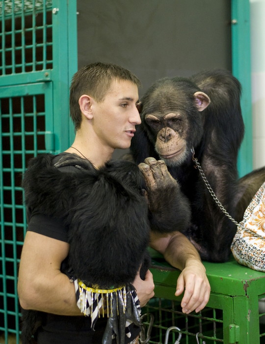 Сквозь прутья вольера Ричард смотрит умными внимательными глазами и четко выполняет просьбы дрессировщика покружиться и похлопать. Кстати, трюк, где он поднимает ногу и с упоением хлопает по ней ладонью, Ричик придумал сам во время игры. Дрессировщику идея понравилась, и он решил включить самодеятельность обезьяны в концертный номер.