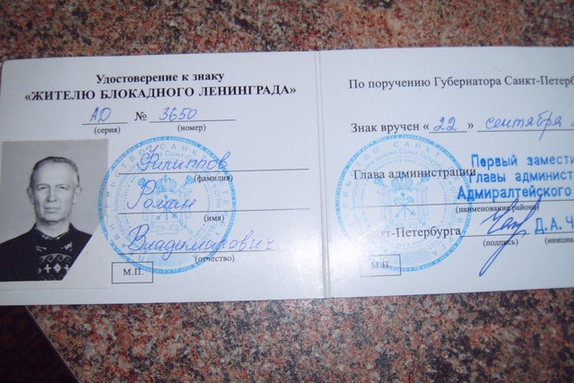 Два года назад Роман Филиппов от имени губернатора Санкт-Петербурга получил из рук руководителя ивановского региона Павла Конькова знак и удостоверение «Житель блокадного Ленинграда». У майора милиции в отставке есть ведомственные и государственные награды. Но этот знак, признается он, – самая дорогая награда.