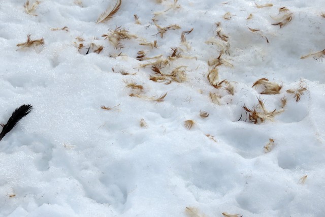 Визит чупакабры к Инне Аркадьевне состоялся в конце февраля, но рядом с ее домом до сих пор остались следы пребывания. Сзади бани на подтаивающем снегу – несколько мест с бело-коричневыми перьями. Складывается ощущение, что неведомая зверюга разложила куриц в полуметре друг от друга и ощипала их. Крови нет, зато явно видны чьи-то большие следы.