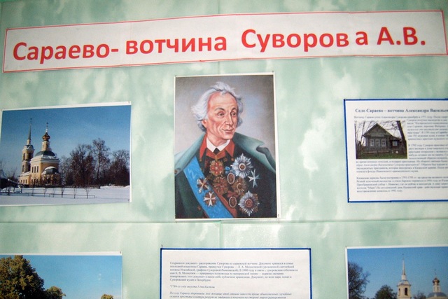 В прошлом году к 285-летию со дня рождения Суворова в селе хотели открыть музей в самом старом доме. Но, говорит директор Сараевского клуба Юлия Соколова, выкупивший его плёсский предприниматель больше в селе не появлялся. Собранную к юбилею экспозицию народного быта пришлось открыть прямо на сцене клуба – по ее краям, чтоб не мешала выступать артистам.