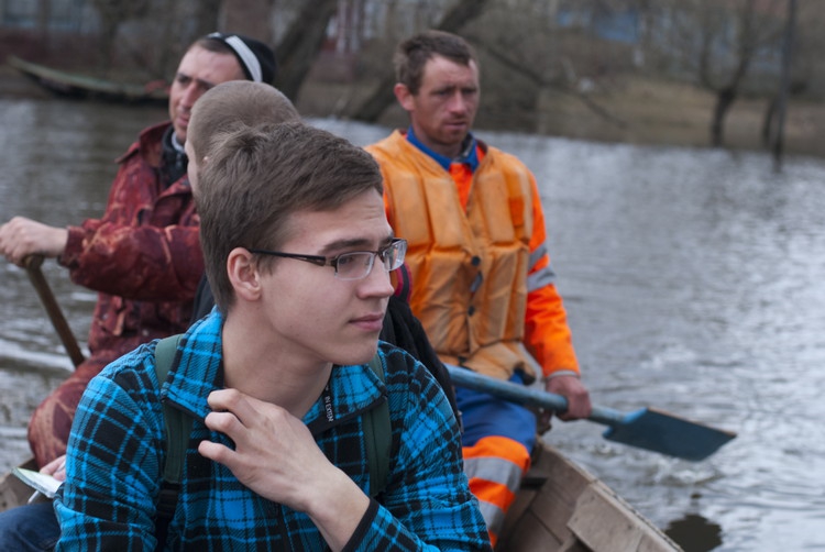 Народ на переправе подшучивает над гребцами и обсуждает уровень воды. Почти у каждого дома стоят свои мерки, и, ожидая лодки, холуйцы горячо сравнивают результаты и осмеивают прогнозы синоптиков. По их опыту, есть только две верные приметы, по которым можно определить уровень воды и длительность наводнения: количество снега в лесах и фаза Луны. Вода прибывает с растущей Луной, пик затопления обычно приходится на полнолуние, потом Теза начинает спадать. Снег до сих пор лежит в лесах, по пойменным лугам водица потихоньку окружает поселок. Дождь в выходные добавил головной боли селянам. По словам старожилов, простоит вода еще полторы-две недели.
