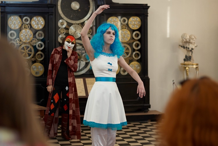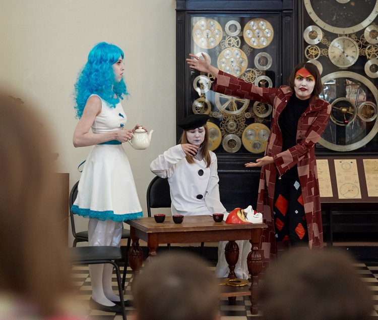 А музейное пространство у знаменитых часов оживили актеры театра «Пророчества в рамках плеч». Они разыграли небольшое представление о том, что случается со знаменитыми куклами (Мальвиной, Артемоном, Пьеро и Арлекином) после того, как они остаются одни. Спектакль так и назывался: «Сундук с куклами». Каждая из кукол чувствует себя настоящим актером, пока не закончится ее заряд и пока кукольный театр, в котором они играют, не перестанет существовать. А дальше – забвение, нафталин, большой темный сундук…
