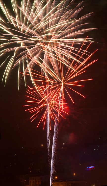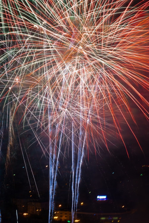 Завершилось празднование традиционным конкурсом фейерверков, предварил который проливной дождь. Молнии органично вплетались в узоры разлетающихся салютов, придавая действу особый шарм. В очередной раз ливневки на площади Пушкина не справились с водной стихией, и некоторые зрители, воспользовавшись этим, устроили забавную «водную битву».