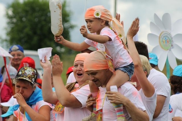 Праздник начали с парада команд и продолжили визитными «шумелками». Необычными костюмами удивили «индейцы» команды «Ладушки» из Ивановского района. «Пришлось даже покупать птичьи перья, чтобы соорудить из них головные уборы», – рассказали члены семьи Гвоздик. Вождь краснокожих по профессии – закройщик одежды. Он-то и соорудил яркие костюмы для домочадцев.