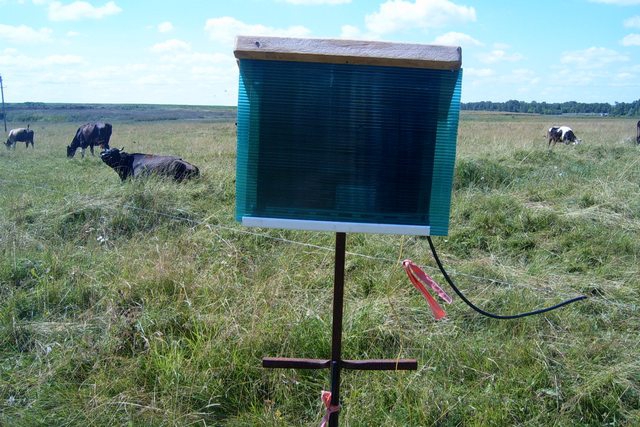 Устройство с проводами и щитком приобрели вскладчину. Буренки пасутся, зная, что можно получить легкий электрический разряд, если попытаешься уйти из загона.