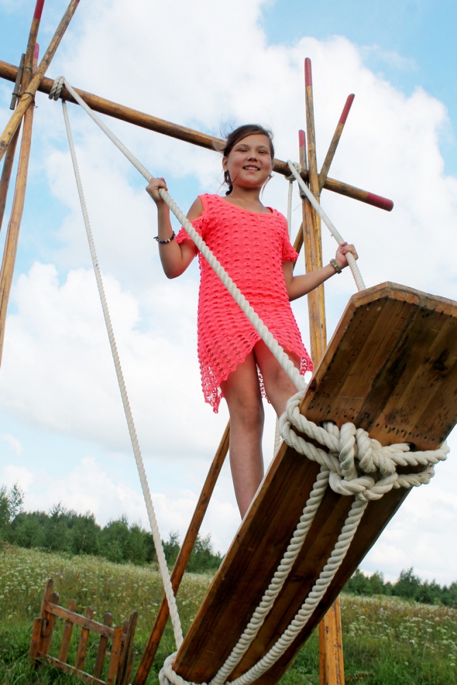 А рядом другая качель – на огромную доску могут встать сразу несколько человек и раскачаться тоже на немалую высоту: небо – поле, небо – поле, небо – поле!..