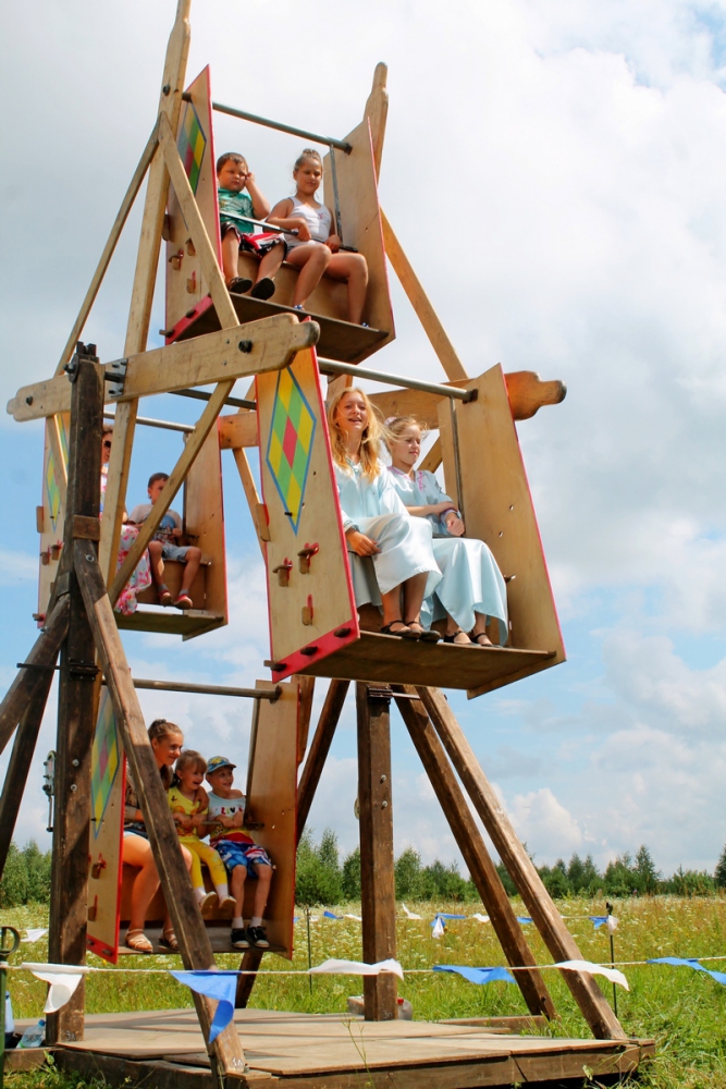 Алексей Миневич из Москвы как-то увидел на старинной гравюре необычное сооружение – круговую карусель и решил построить такую же. К тому, же она разборная - покатал, разобрал и дальше поехал народ веселить. Во время царских пиров такую устанавливали для развлечения детишек, да и парни с девушками катались. Никакой механики! Карусель раскручивают вручную, для баланса сзади сидений кладут канистры с песком. Визг летит с высоты 7 метров! Ух, адреналин зашкаливает!