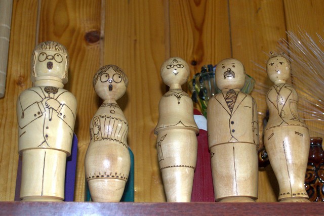 В кабинете директора школы искусств Галины Фроловой на полке представлен весь педагогический коллектив в миниатюре, сделанный из дерева руками Владимира Николаевича. У каждого человечка своя отличительная черта, по которой невозможно не узнать учителей и не улыбнуться. Рядом – различные матрешки, вазочки (есть даже из кокосового ореха), игрушки с подвижными суставами, герои мультфильмов. Есть и игрушка, идея создания которой родилась из обычных клякс, которые ребенок поставил на бумаге, а затем решил, что это – невиданное животное. Теперь это зверушка, сделанная из дерева.
