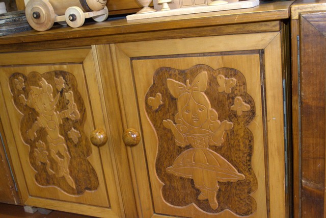 Не всегда сразу понимаешь, чем может стать невзрачный на первый взгляд кусок дерева или кривая коряга. А бывает, что хочется проверить уровень своего мастерства. «Вот, например, эта мебель, – рассказывает он, показывая на стенку в зале, на дверках которой выточены Буратино и Мальвина. – Мне было интересно, смогу ли я сам сделать шкафы из дерева. Получилось. Хотел нарисовать историческую картину – нарисовал, писал и портрет на заказ».