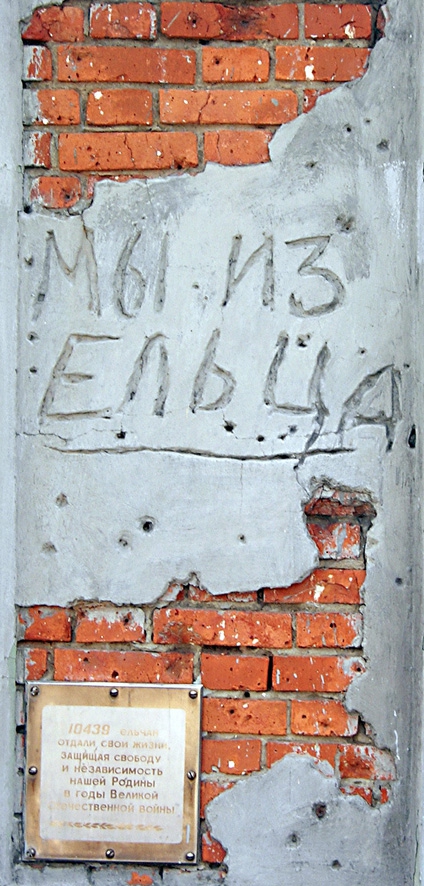 На площади Победы установлен памятный знак участникам и жертвам Великой Оте чественной войны (в виде трех штыков, устремленных в небо). Здесь же стоит точная копия стены с надписью на стене Рейхстага – «Мы из Ельца», принесшей мировую известность городу. Ее сделал ельчанин, гвардии сержант Борис Сидельников.
