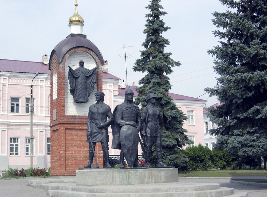 В Ельце, как и в Москве, имеется Красная площадь. Она располагается на месте бывшей торговой площади Елецкой крепости и напоминает не о красоте, а о пролитой здесь крови. Тут же, напротив храма, к 850-летней годовщине основания города установили памятник защитникам Ельца всех времен: древние воины стоят рядом с солдатом XX века.