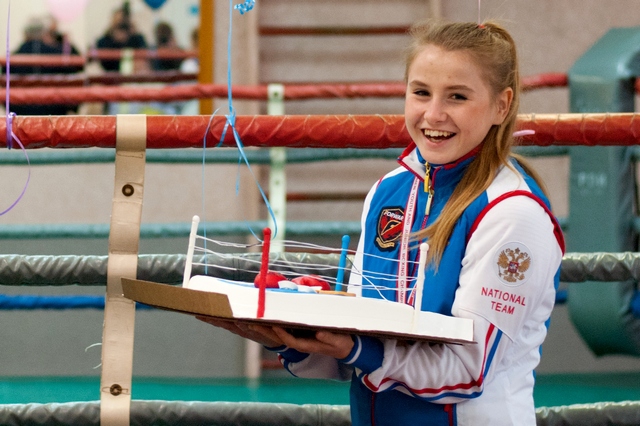 В 7-й спортшколе чемпионке подарили торт в виде боксерского ринга.