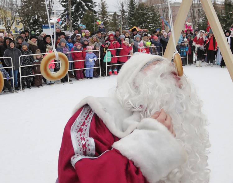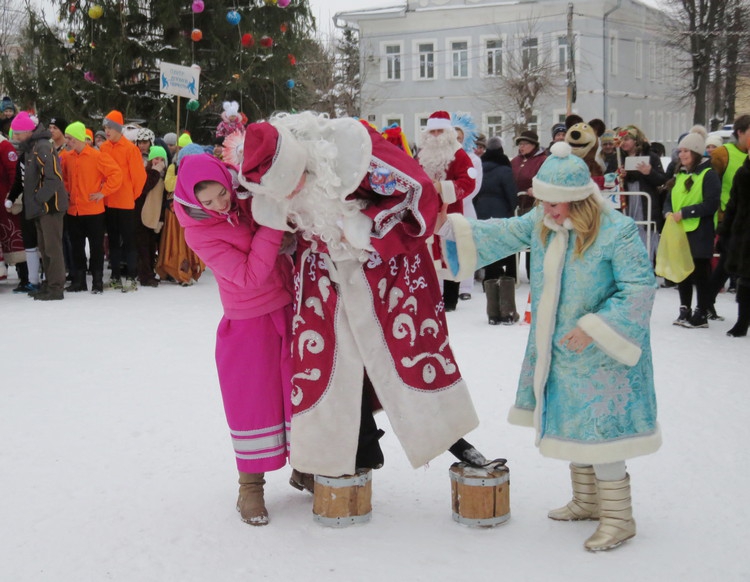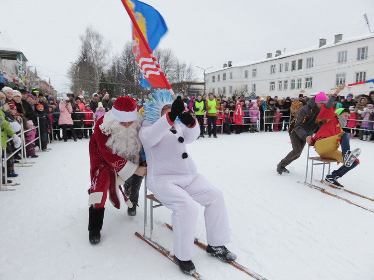 Чтобы завоевать звание чемпиона, Морозы и их свиты ходили на ходулях из пеньков, устраивали гонки на санях, ели подвешенные баранки, катали яйца по желобам… Самым быстрым оказался Дед Мороз Х.