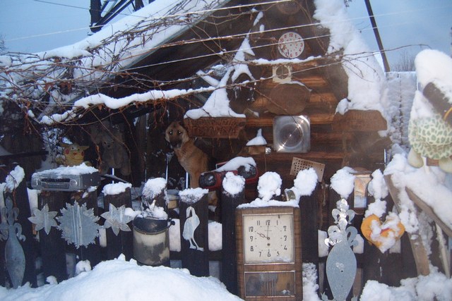 Для четвероногих охранников во дворе построена даже не будка, а небольшой домик – не столько прикладного народного творчества, сколько искусства инсталляции, к которой тяготеет автор. Сюда Вячеслав Сергеевич поместил старые часы, радиоприемник, телевизор… «Злым» псам «смотреть телевизор» надоело, и они весело выскочили во двор. Но Шабанов загнал их обратно со словами: «Это при мне они добрые, а для чужаков, когда заходят без нас, – злейшие враги».