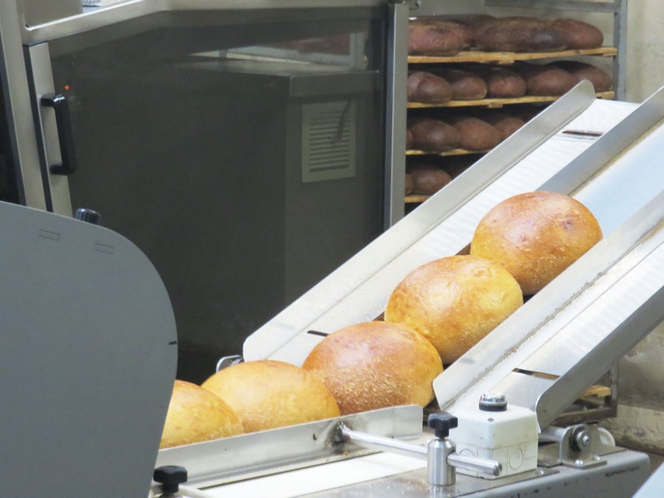 На выходе буханки смазывают специальным клейстером, чтобы они дольше сохраняли влагу и полезные свойства.