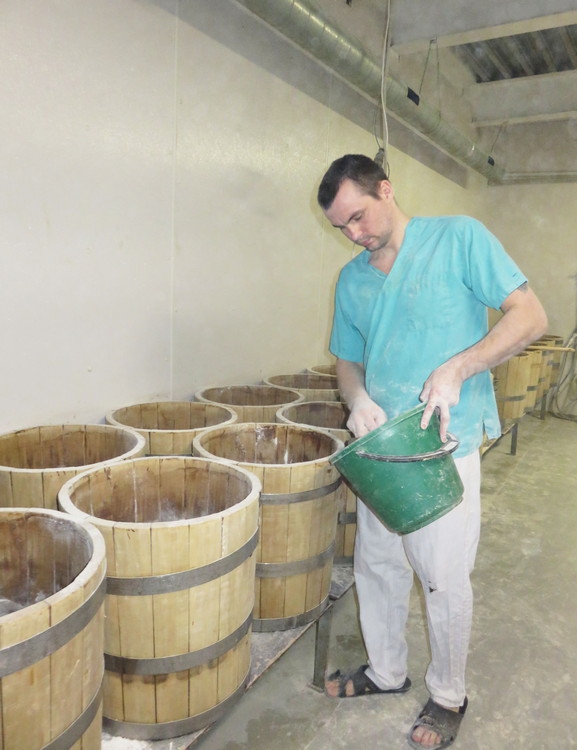 Очищенную муку помещают в осиновые кадки и ошпаривают. Именно осина придает хлебу неповторимый вкус, уничтожает болезнетворные бактерии и развивает необходимые кисломолочные, которые способствуют естественному брожению теста.