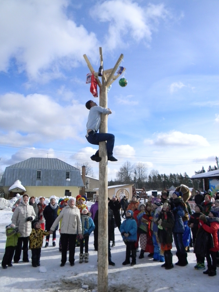 Не обошлось и без исстари любимого развлечения – состязания силачей. Мужчины с удовольствием поднимали пудовые гири, а потом демонстрировали свои навыки в ловкости: далеко не каждый смог вскарабкаться на высокий столб с привязанными к нему призами. И всё же смельчаки нашлись – в пылу азарта они скидывали с себя куртки и, подбадриваемые легким морозцем, взбирались вверх по толстому и гладкому столбу в погоне за наградой.