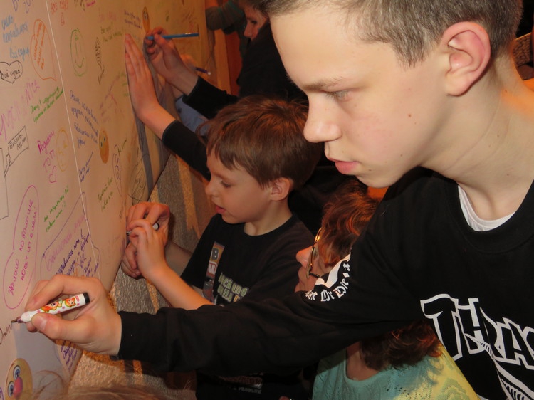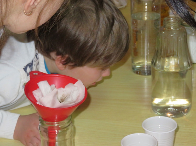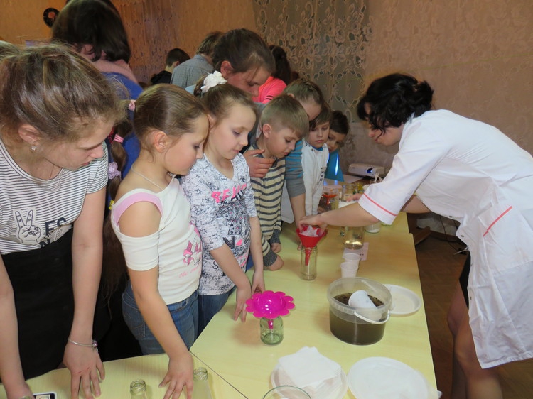 Не забыли организаторы и про Год экологии. Гостей Библионочи встречал макет земного шара с навешанными цветами и… мусором. Посетителям предлагалось выбрать, какой они хотят видеть свою планету. А по сценарию экоквеста на планете произошла катастрофа и участникам игры необходимо было выполнить ряд заданий, чтобы спасти землю. Легенду поддерживал и антураж помещения: подвешенные к потолку макеты планет Солнечной системы и Солнце. Участникам, в частности, требовалось очистить воду с помощью фильтров; научиться делать лавовую лампу из воды, масла и соли; познакомиться с «поющим воздухом» – звуками, извлекаемыми из бутылок с разным количеством воды.