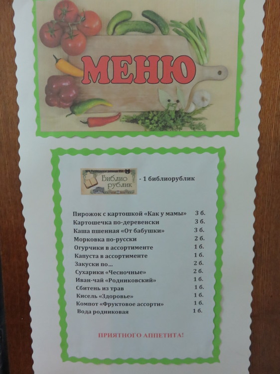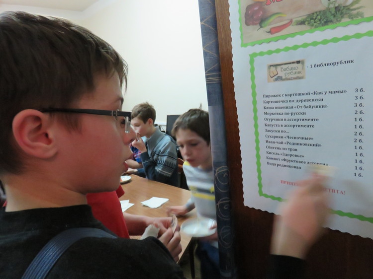 За выполнение заданий участники получали местную валюту – «Библиорублики», на которые можно было хорошо перекусить в столовой, организованной работниками библиотеки. Кстати, тема экологии обыгрывалась и здесь. Посетителей призывали питаться своей, здоровой, а не «заморской», пищей: тыквенной кашей, пирожками, картошкой и морковкой, запивая всё это компотом и киселем…