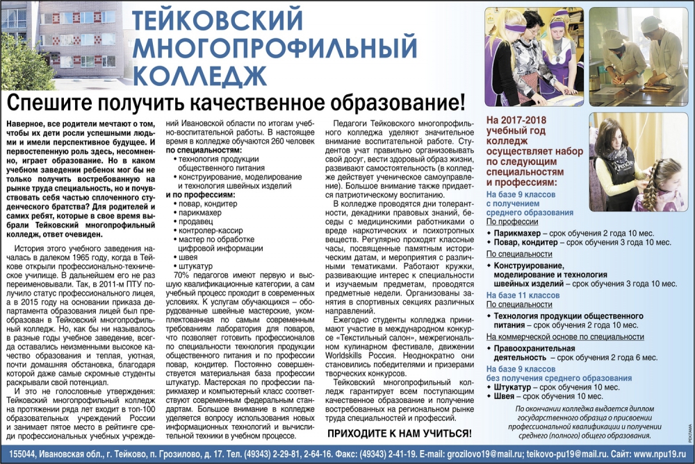 А ведь ситуация в системе профессионального образования Ивановской области в последние годы складывалась непросто. Многие колледжи были реорганизованы и присоединены к более крупным и успешным учебным заведениям. Так, Шуйский сельскохозяйтвенный колледж несколько лет назад был присоединен к Шуйскому профлицею № 4. В результате был организован Шуйский технологический колледж – одно из самых успешных учебных заведений региона. И таких примеров немало. Совсем недавно, в начале 2017 года, было принято решение о закрытии Комсомольского филиала энергетического колледжа. Все студенты были переведены в головное учреждение в Иваново.