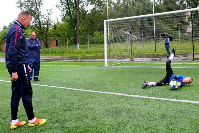 Вначале были мастер-классы для юных футболистов, и не только для вичужан, но и для ребят из ивановского «Текстильщика». Всех ребят разделили на несколько групп, и в течение получаса с ними занимались Алексей Медведев, Эрик Корчагин, Валерий Чижов и Левани Гвазава. Последний был наиболее эмоционален. Все мальчишки сначала тушевались, а потом разыгрались. И это при сильном дожде!