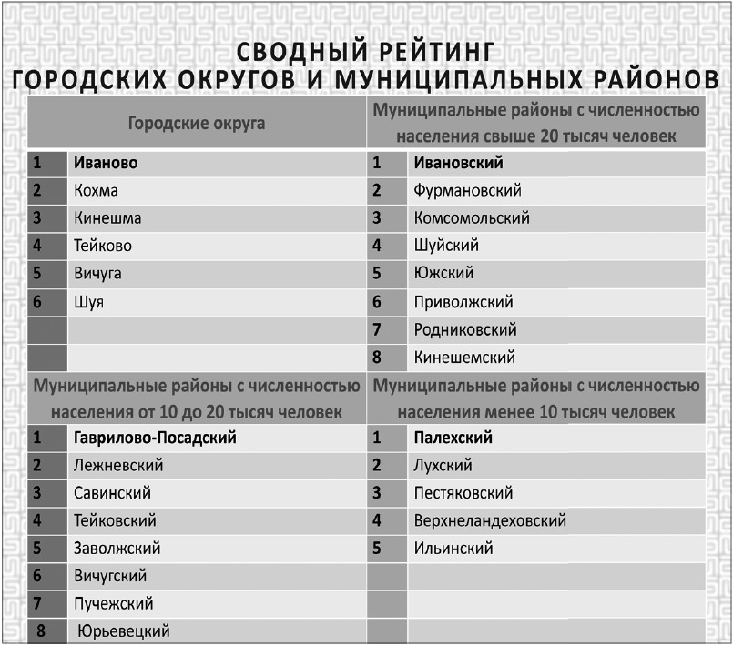 Среди районов с населением свыше 10 тысяч первое место – у гавриловопосадцев. Положительное влияние на комплексную оценку оказали высокие результаты объема инвестиций, собственных доходов бюджета, обеспеченность библиотеками, количество физкультурников. И – низкие очереди в детсады. Несмотря на провалы в отдельных показателях, тейковчане и пучежане – среди лидеров. Ну а аутсайдеры в этой группе – южане.