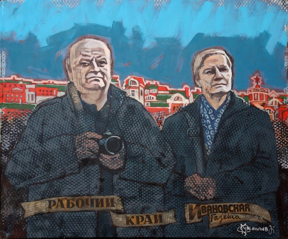 Есть на выставке и упоминание о нашей газете. Светлана Кузьмичёва написала портрет своих друзей-фотокоров Владимира Егорова и Евгения Горностаева, нашего бывшего коллеги. Под каждым полотном – название газеты, где работал фотожурналист. Под портретом Евгения Александровича красуется: «Ивановская газета».