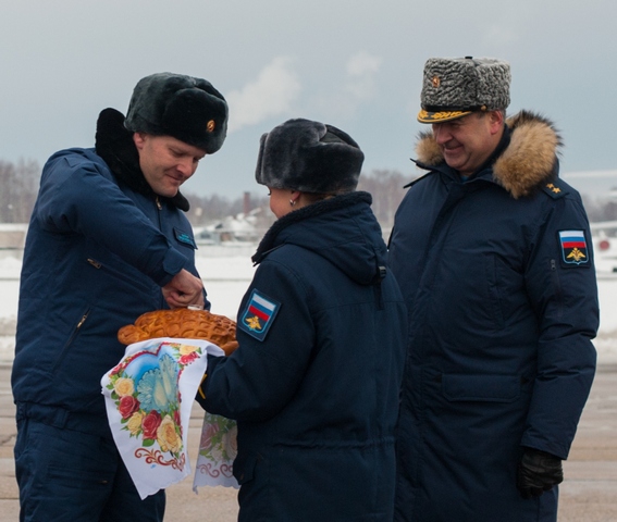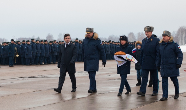 Хлеб-соль вручается командиру экипажа А- 50 майору Александру Прокудину и командующему ВТА генерал-майору Владимиру Бенедиктову.
