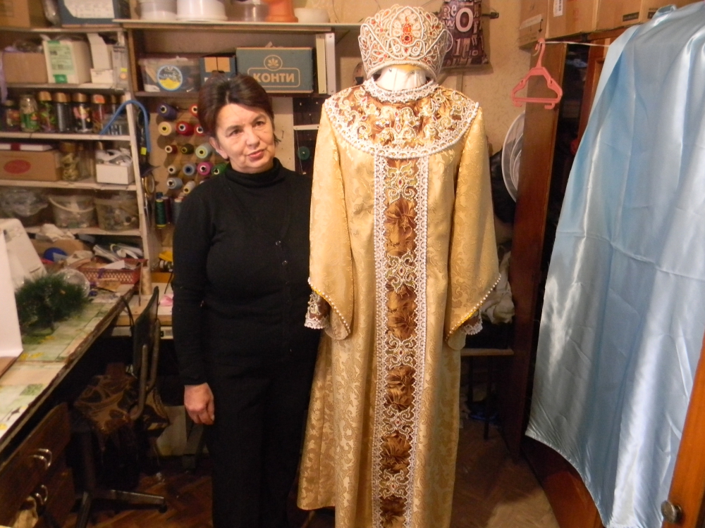 Неописуемой красоты и легкости кокошник (мастер творила его три года!), переливы бисера на бархате. Всё это сшито из материалов, купленных на средства пенсионерки: «Я приобретаю бисер, бархат (недавно нашла по Интернету образцы 1950-х годов – какая удача!), другие ткани, камни. Сама рисую эскиз, шью, вышиваю. Это увлечение с шести лет и уже стало чуть ли не профессией. Работы мне заказывают клубы исторической реконструкции, организаторы различных фестивалей, музеи…». Наряды для артистов клуба мастерица шьет бесплатно.