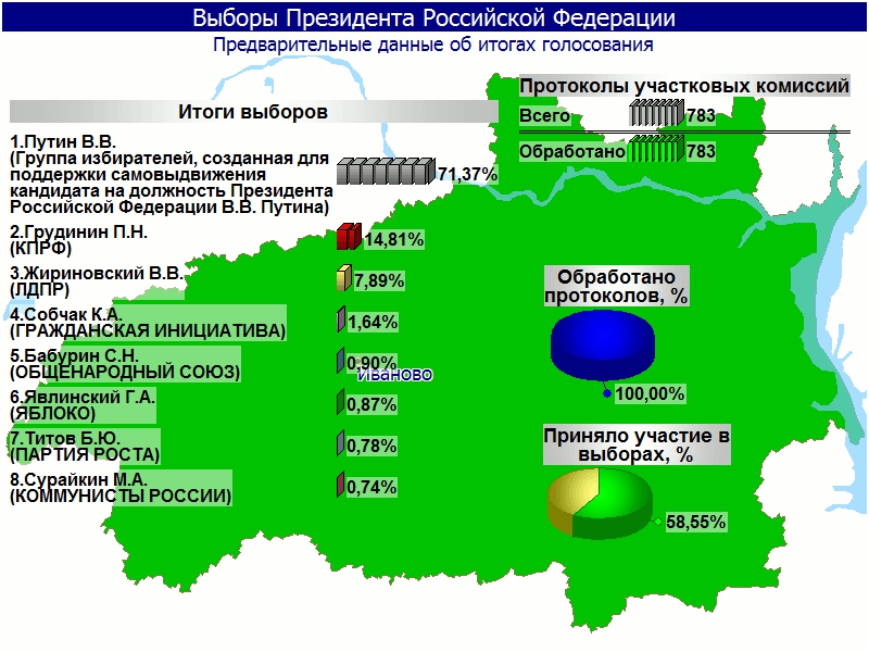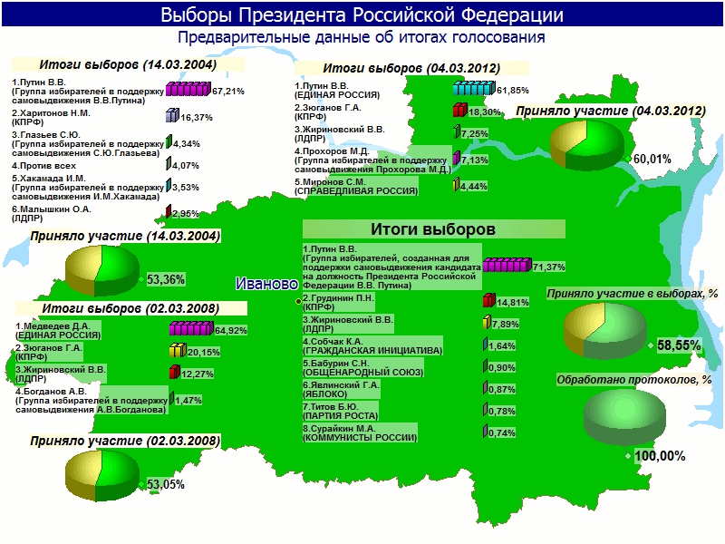 Средний результат голосования за Владимира Путина по области - 71,4%, что ниже, чем в среднем по России (76,7%). В ЦФО результат Путина еще меньше в Костромской, Ярославской областях и Москве. Самые высокие результаты за действующего президента показали Комсомольский (78,5%), Верхнеландеховский (76,6%), Ивановский (76,4%) районы. Самые низкие – Тейково (69,1%), Кинешма (67,9%), Шуя (66,7%).