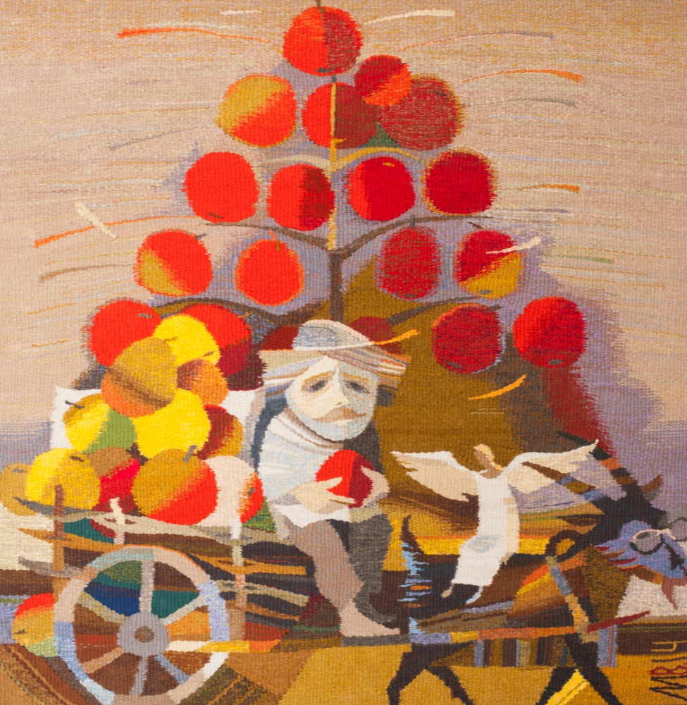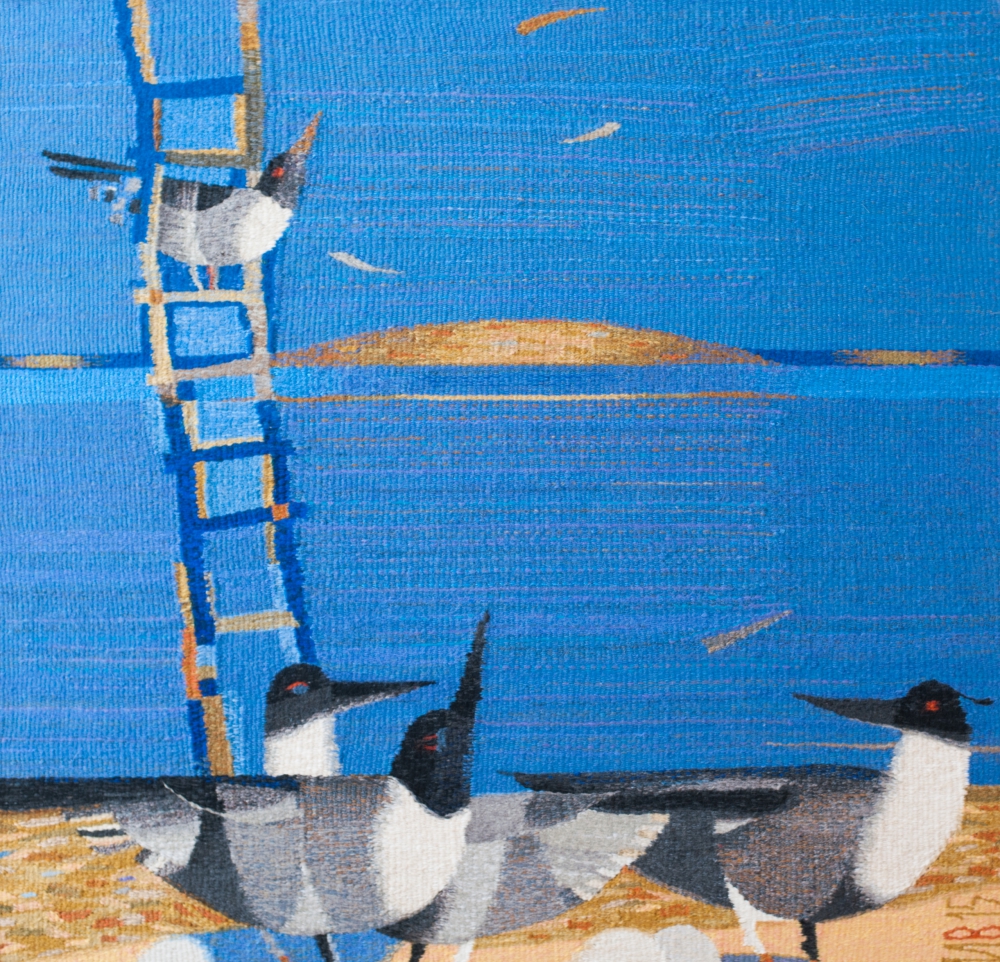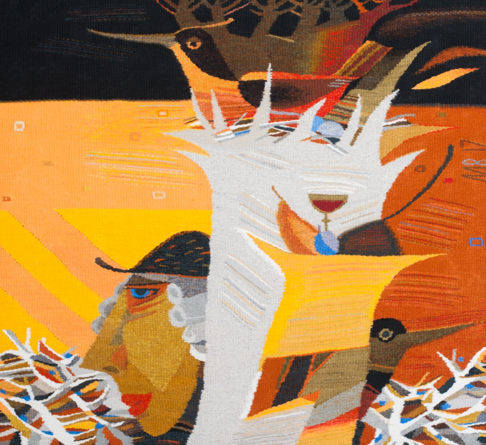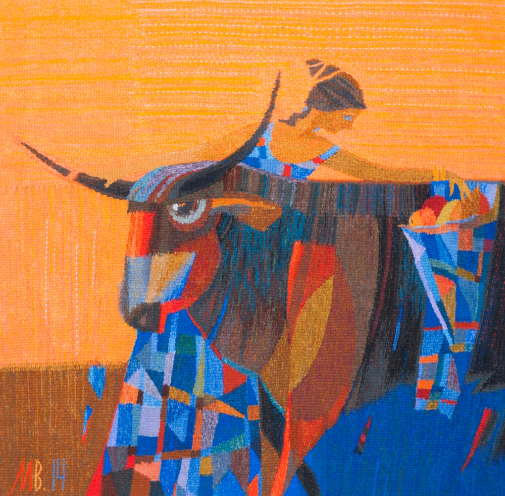 Владимир Мухин в технике гобелена создает сложные и глубокие, наполненные смыслом полотна. В экспозицию органично вписалась и его графическая серия, выполненная темперой. Большие фигуры, приглушенные краски, широкие «шерстяные мазки»… В гобеленовом мире тепло и уютно, как бывает уютно сидеть в зимний вечер у теплой печки, когда за окном бушует метель. Работы Мухина хочется потрогать руками, чтобы почувствовать тепло ниток и ощутить себя частью этого сказочного мира.