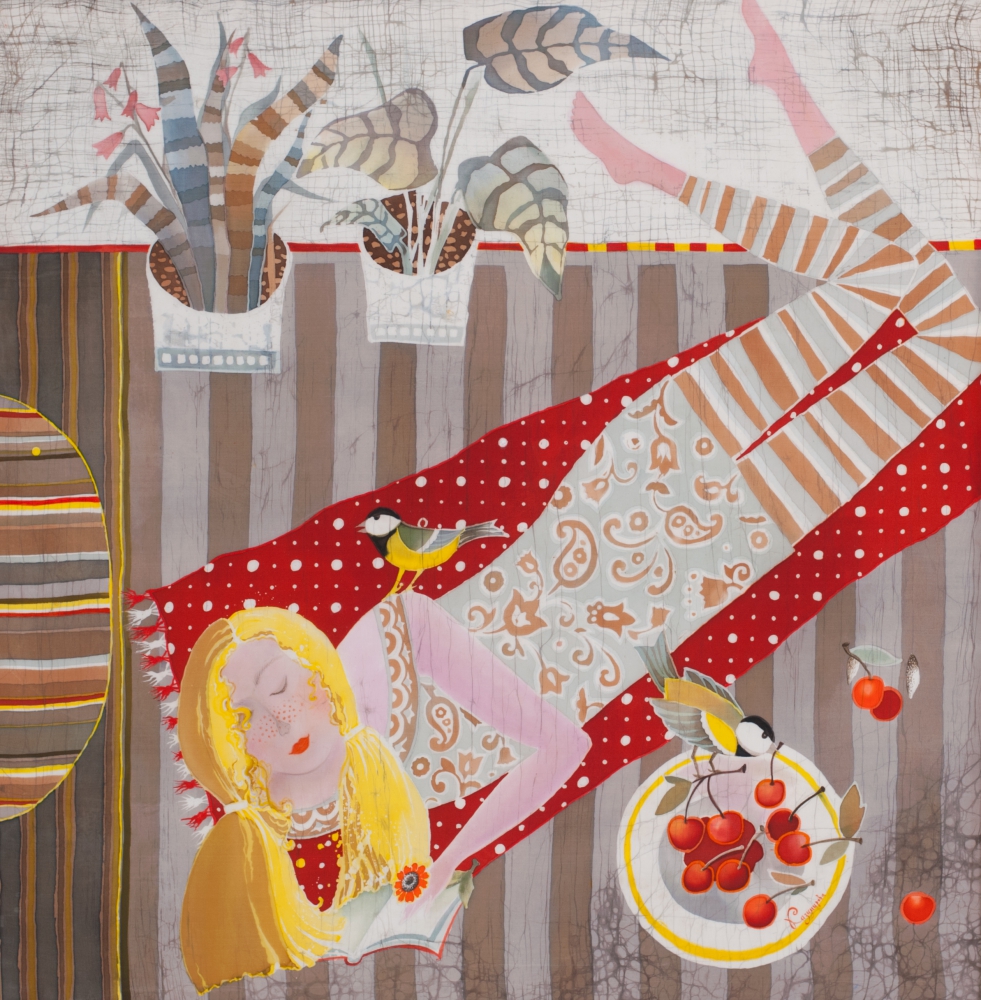 Напротив, батики Ирины Казимировой посвящены весне. И даже не сюжетно, а, скорее, своим настроением. Художница обожает яркие краски, и каждая ее работа – настоящий праздник. Сказочные герои и невероятные сюжеты, акварельные разливы красок на шелке и даже бытовые зарисовки – всё дышит весной, свежестью, радостью.