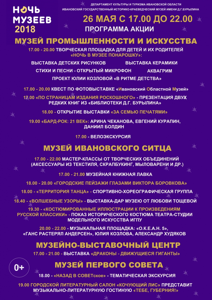 ИВАНОВО В Ивановском государственном историко-краеведческом музее имени Д.Г. Бурылина акция пройдет 26 мая с 17.00 до 22.00 сразу на четырех площадках – в Музее промышленности и искусства, Музее ивановского ситца, Музее первого Совета и Музейно-выставочном центре.