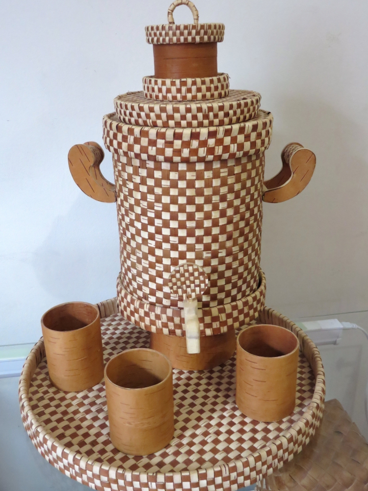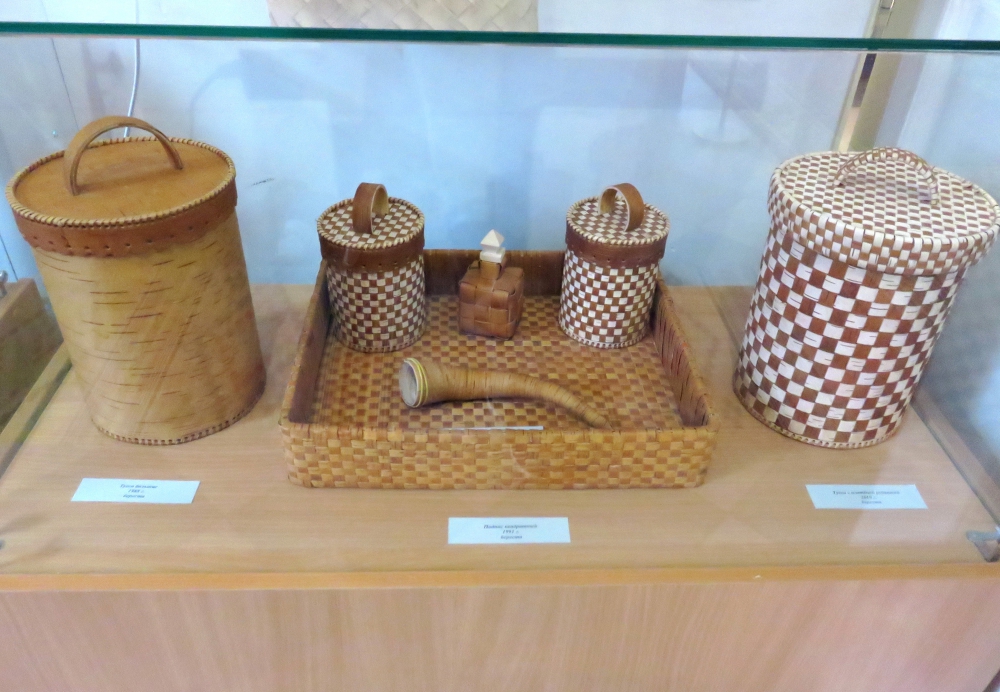 Более 120 изделий представлено здесь: туеса, подносы, корзиночки… Внимание посетителей обязательно привлекут берестяной самовар со стаканами, самодельные сапожки и лапоточки. Есть сахарницы и подносы, шкатулки, броши…