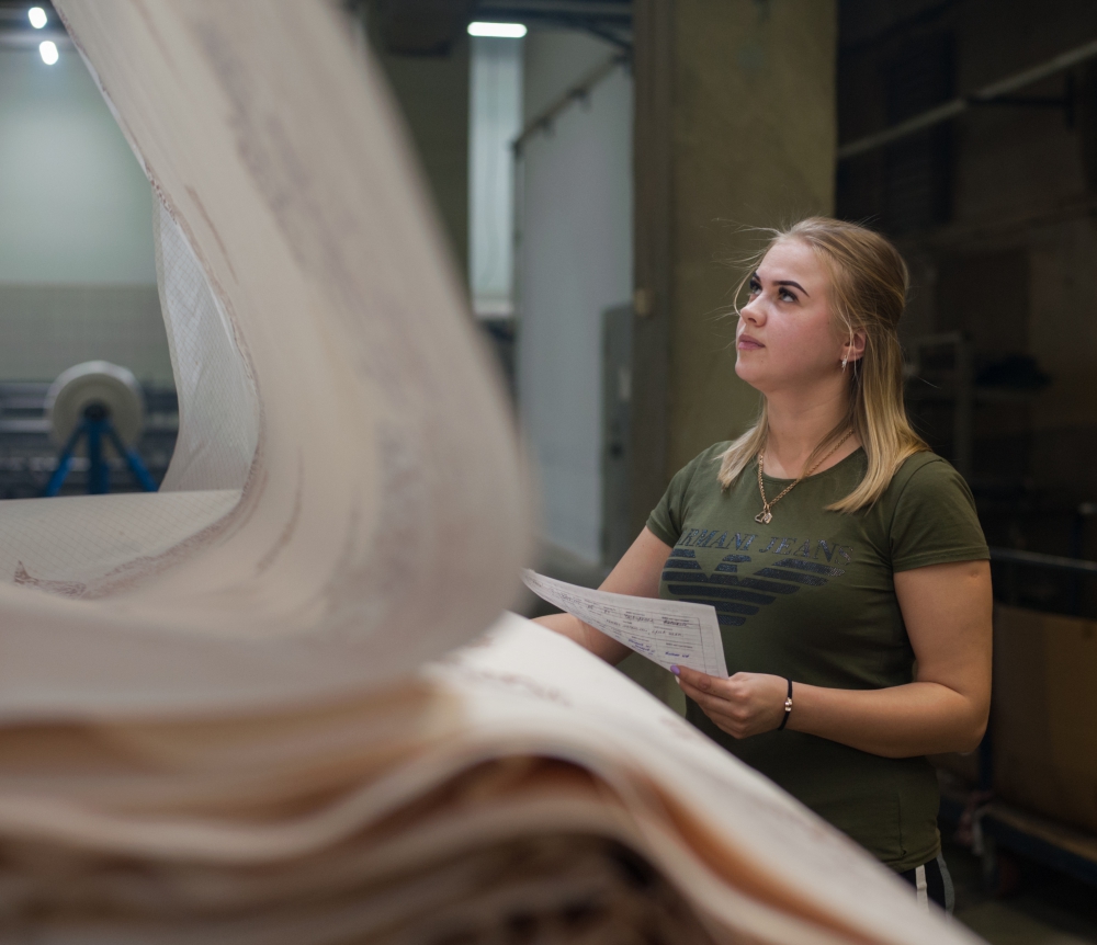 Контролер качества Юлия Баженова говорит, что в этом многообразии красок и оттенков она должна усмотреть малейший изъян. Молодая женщина на комбинате шесть лет и очень довольна своей работой, дорожит ею.