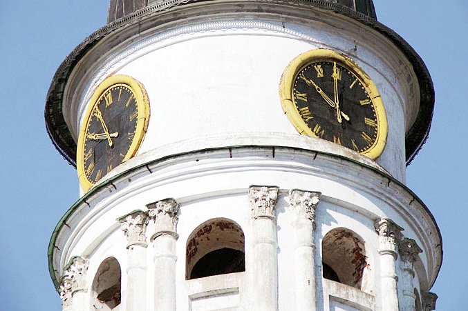 Огромные часы с четырьмя циферблатами, на все четыре стороны света, заводят раз в пять-шесть дней. Сначала это делали вручную. «Механизм тяжеленный, нагрузка равна примерно 180 килограммам, – рассказывал Юрий Чудов. – На то, чтобы завести часы, уходило минут 25». Со временем появился специальный электромотор, с помощью которого часы заводят и поныне. Правда, в последние несколько лет это делает сын Чудова – Михаил. Самому Юрию Ивановичу было уже тяжело преодолевать 232 ступеньки, что ведут к часам.