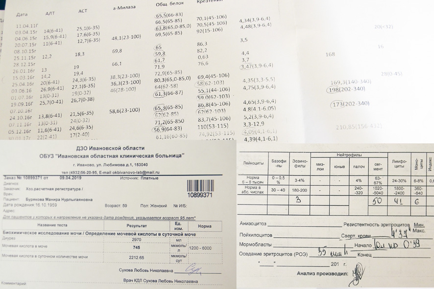 В поликлинику она ходит, как на работу, продолжая фиксировать все заключения врачей и результаты анализов в дневники самочувствия. В многочисленных таблицах с динамикой заболевания действительно видны отклонения от нормы. Повышенный уровень СОЭ (скорость оседания эритроцитов) в крови, холестерина, белка в моче… Манира Нурлыгаяновна возмущена и обижена на врачей, упорно не желающих, по ее словам, замечать эти изменения.
