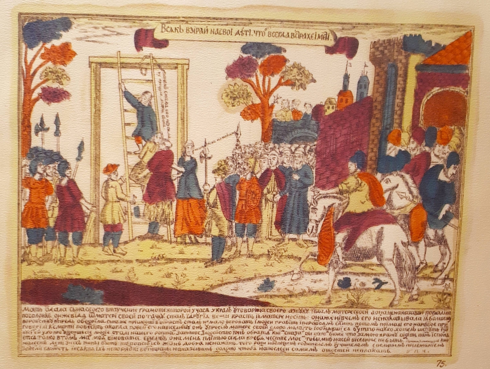 Молодой человек приговорен к казни за воровство. Объясняя свое преступление, он рассказывает, что с самого детства крал. Например, азбуку у товарищей. А мать его поощряла. С возрастом размер наворованного увеличивался. Перед смертью преступник перекладывает всю ответственность на родителей. Посыл этого лубка прозрачен: у непорядочных родителей вырастает непорядочный ребенок.